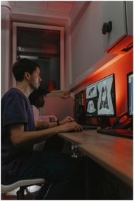 Doctors reviewing diagnostic X-ray images on computer in a clinical setting.