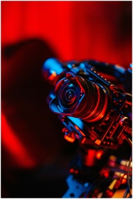 A DSLR camera with vibrant lighting on a photography set.