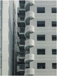 Close-up shot of contemporary residential buildings showcasing distinctive balconies in Tokyo, Japan.