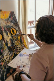 An adult painter works on an abstract cat portrait