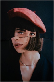 Striking studio portrait of a young woman with a red beret, emphasizing artistic style.