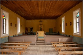 Interior view of a historic church in Terlingua, Texas, featuring wooden pews and religious altar.