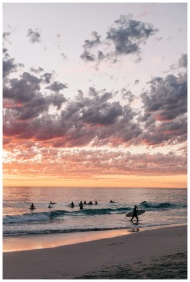 Surfers enjoy the waves under a dramatic sunset sk