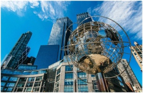 Captivating view of New York City skyline featuring a prominent globe sculpture and tall skyscrapers.