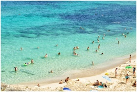 People enjoying a sunny day at a beautiful beach in Mallorca, Spain, with turquoise water and sandy shores.