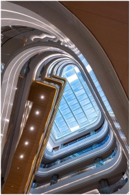 View of a modern multi-storey building interior featuring a skylight and sleek architectural design.