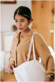 Young woman holding a sustainable cotton shopping bag, embracing eco-friendly lifestyle indoors.