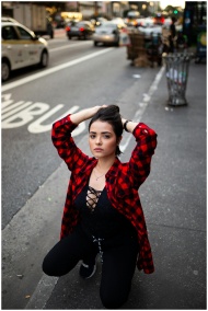 Model posing in urban São Paulo with a stylish outfit during a photo session.