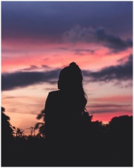 A woman silhouetted against a vivid sunset, blending in soft colors of dusk.
