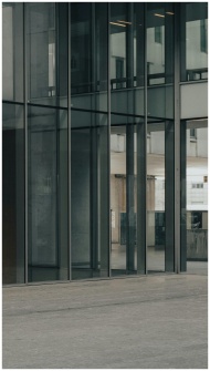 Sleek modern architecture with glass facade in an urban setting, showcasing reflective surfaces.