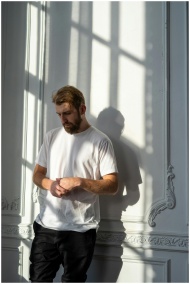 A thoughtful bearded man in a white t-shirt stands in a sunlit room with ornate walls.
