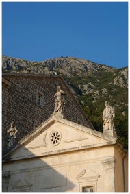 A stunning architectural structure in Montenegro adorned with classical sculptures, set against a mountainous backdrop.