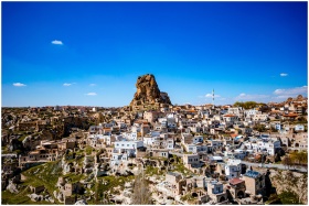Explore the breathtaking rock formations and historic architecture of Ortahisar in Cappadocia, Turkey.