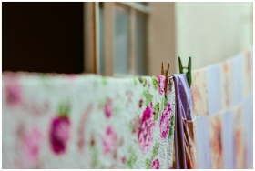Close-up view of floral and patterned laundry hang