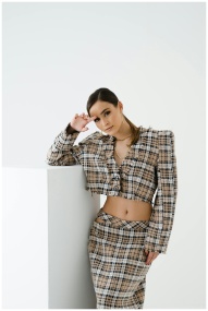 Elegant woman posing in plaid pantsuit on a white