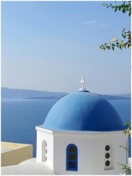 Iconic blue-domed church in Santorini with a clear view of the Aegean Sea, Greece.