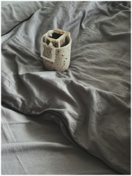 A cozy bedroom with a glass of coffee resting on w