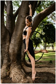 Aerial gymnast in graceful pose on ring, outdoor park setting, surrounded by trees.