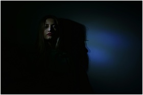 A dark, mysterious portrait highlighting shadows cast by a woman's face.