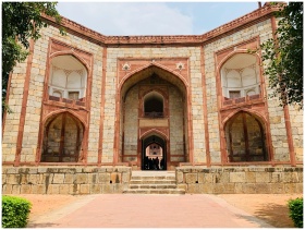 Exterior view of Bu Halima Gateway in India showcasing its architectural details and entrance steps.