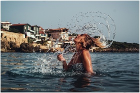 A joyful woman flips her hair while swimming in th