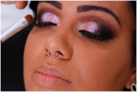 Close-up of an adult applying glittery eye makeup