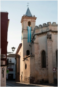 Gothic church tower with colorful banners in Sevil