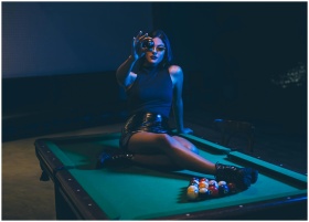 Elegant woman poses on a billiard table, combining