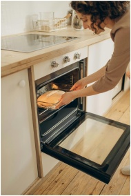 Adult woman placing bread in oven, showcasing home baking in a modern kitchen.