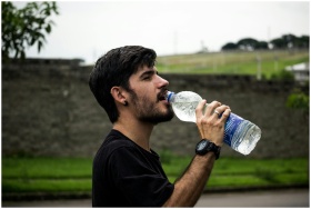A young man drinks bottled water outside, staying hydrated and refreshed.
