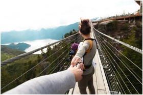 A woman with a baby crosses a scenic hanging bridge, holding hands amid a mountainous landscape.