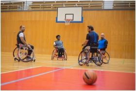 Four men in wheelchairs playing basketball indoors, focusing on adaptive sports and teamwork.