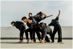A group of adults performing dynamic contemporary dance on a rooftop.