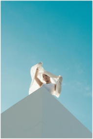 Artistic shot of a woman in white against a clear blue sky, low angle view.