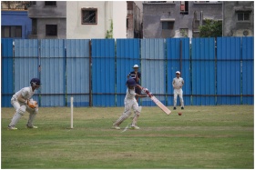 Action shot of teenagers playing cricket on a gras