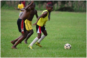 Action shot of teenage boys playing soccer outdoors on a grassy field in Kakamega, Kenya.
