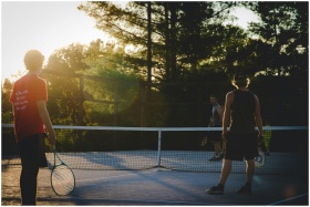Three young men playing tennis on an outdoor court at sunset, capturing a vibrant and active moment.