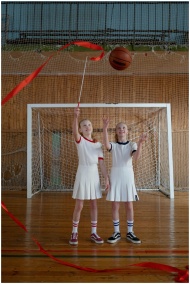 Two young girls practicing rhythmic gymnastics with ribbons in a sports hall, showcasing fun and fitness.