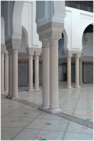 Beautiful Moroccan-style columns and arches in a Parisian courtyard. Captivating architecture.