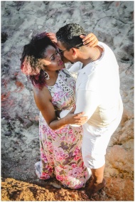 A loving couple sharing an intimate moment outdoors on a sandy beach.