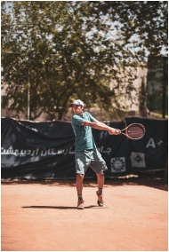 Tennis player in action with a powerful swing on an outdoor clay court.