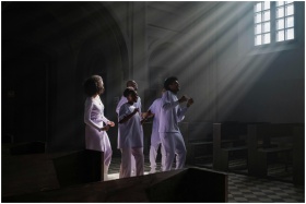 A choir stands united in a church, holding hands i