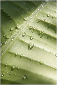 Close-up of water droplets on a leaf illuminated by sunlight, highlighting nature's purity.
