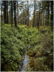 Discover the tranquility of a lush forest landscape in Latvia, featuring a serene stream and tall trees.
