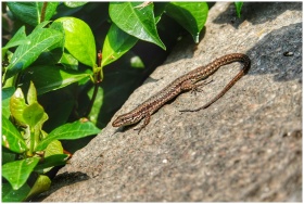 Close-up of an Italian wall lizard basking on a rock in Merano, surrounded by green leaves.