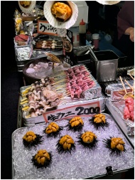 Colorful street food stall in Osaka with fresh sea urchins and skewers on ice.