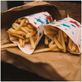 Golden crispy French fries in colorful star-patterned paper wrap on brown parchment.