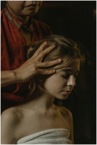 A soothing head massage promoting relaxation and wellness, captured in a peaceful setting.