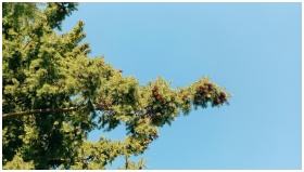 A close-up of a sunlit pine tree branch with pine cones against a bright blue sky.