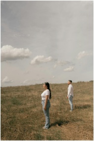 Two adults standing in an open field with a cloudy sky, gazing into the distance.